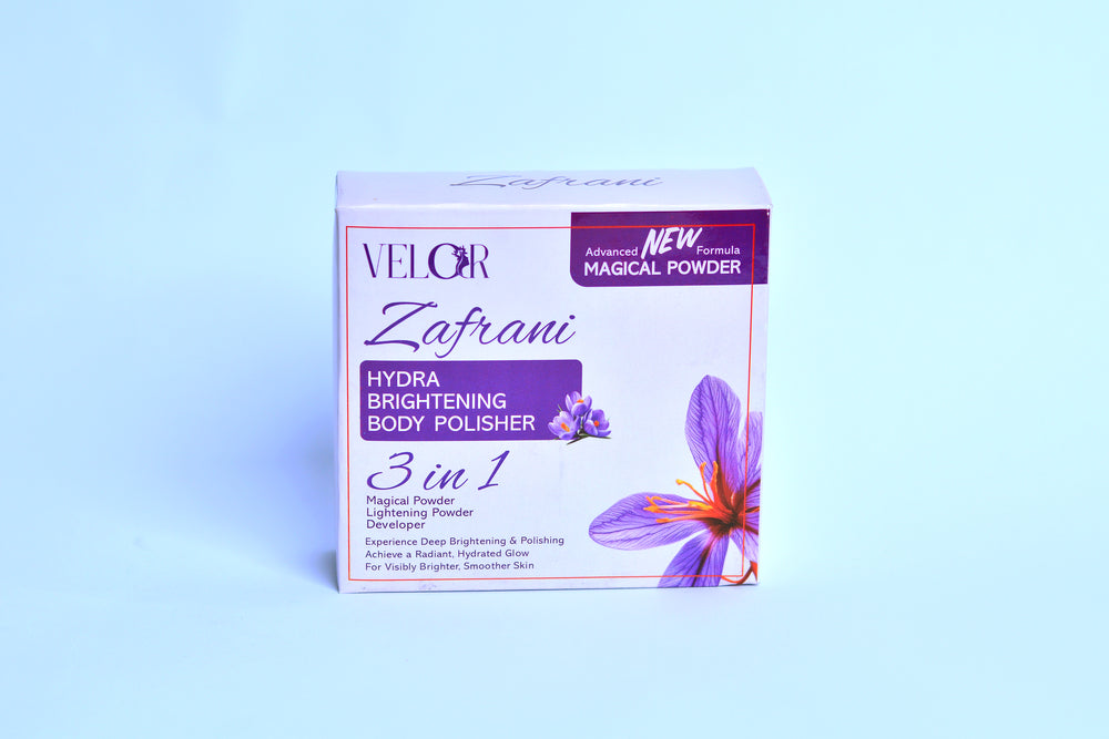 Introducing the Velora Zafrani 3-in-1 Hydra Brightening Body Polisher, your all-in-one solution for visibly brighter, hydrated, and polished skin. Infused with the richness of Zafrani (Saffron) and powered by three core components — Developer, Lightening Powder, and Magical Powder, this set is ideal for full-body skin glow and deep rejuvenation.